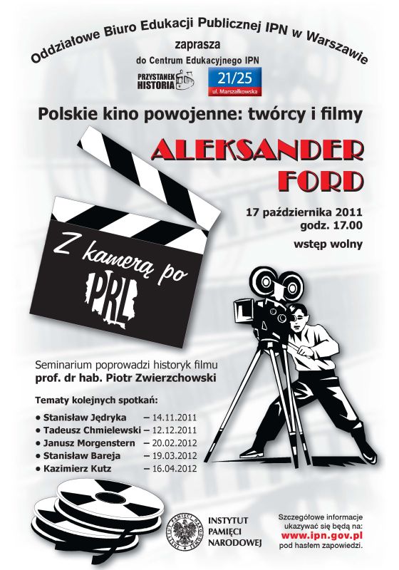 Nowa edycja wykładów „Z kamerą po PRL-u”, przedstawiających wybitnych polskich reżyserów filmowych i ich osiągnięcia artystyczne na tle ówczesnej rzeczywistości politycznej, społecznej i kulturowej. Spróbujemy opowiedzieć o bardzo różnych zjawiskach charakterystycznych dla powojennego kina polskiego: zarówno tych, które wprost wynikały z polityki kulturalnej tamtego okresu, jak i tych niezależnych artystycznie. Oprócz arcydzieł polskiego kina pokazane zostaną także fragmenty filmów o jednoznacznie propagandowym zabarwieniu.