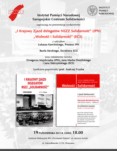 Instytut Pamięci Narodowej i Europejskie Centrum Solidarności zorganizowały prezentację wydawnictw „I Krajowy Zjazd Delegatów NSZZ „Solidarność” (IPN) „Wolność i Solidarność” (ECS) z udziałem Dyrektora ECS Basila Kerskiego i Prezesa IPN Łukasza Kamińskiego oraz redaktorów tomów Grzegorza Majchrzaka (IPN), dr. Bartosza Kaliskiego (IH PAN) Jana Marka Owsińskiego i dr. Jana Skórzyńskiego (ECS). Spotkanie poprowadził prof. dr hab. Andrzej Friszke. Prezentacja odbyła się 19 października 2011 r. w Centrum Edukacyjnym IPN „Przystanek Historia” im. Janusza Kurtyki, przy ul. Marszałkowskiej 21/25 w Warszawie.