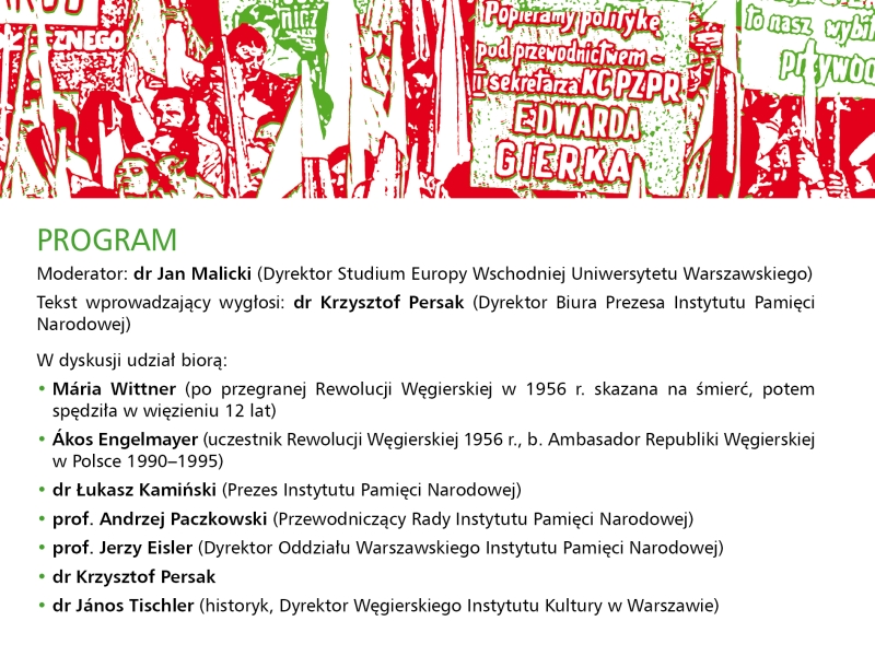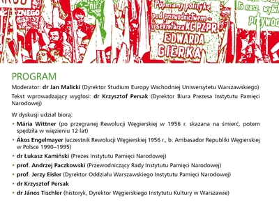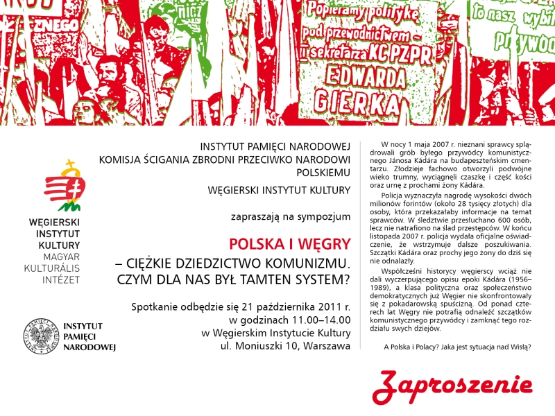 Instytut Pamięci Narodowej – Komisja Ścigania Zbrodni Przeciwko Narodowi Polskiemu oraz Węgierski Instytut Kultury zorganizowały polsko-węgierskie sympozjum „Polska i Węgry. Ciężkie dziedzictwo komunizmu. Czym dla nas był tamten system?”. Spotkanie z okazji 65. rocznicy Rewolucji Węgierskiej 1956 r. odbyło się 21 października 2011 r. w Węgierskim Instytucie Kultury (ul. Moniuszki 10, Warszawa).