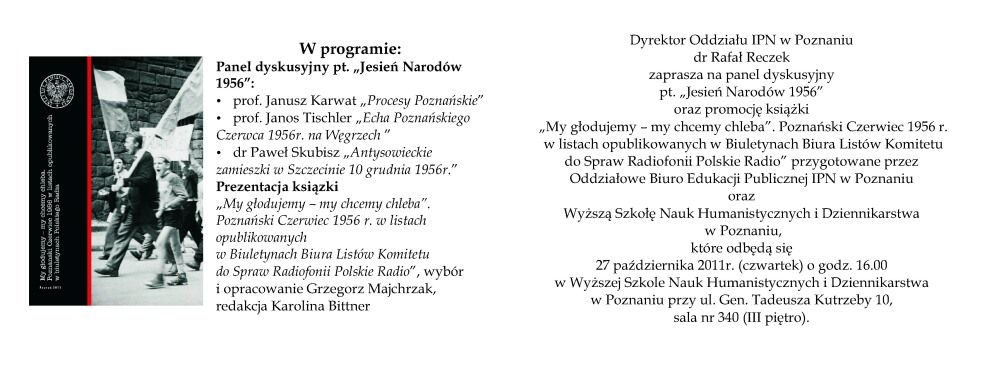 Dyrektor Oddziału Instytutu Pamięci Narodowej w Poznaniu zaprasza na panel dyskusyjny pt. „Jesień Narodów 1956” oraz promocję książki „My głodujemy – my chcemy chleba”. Poznański Czerwiec 1956 r. w listach opublikowanych w Biuletynach Biura Listów Komitetu do Spraw Radiofonii Polskie Radio” przygotowane przez Oddziałowe Biuro Edukacji Publicznej IPN w Poznaniu oraz Wyższą Szkołę Nauk Humanistycznych i Dziennikarstwa w Poznaniu.