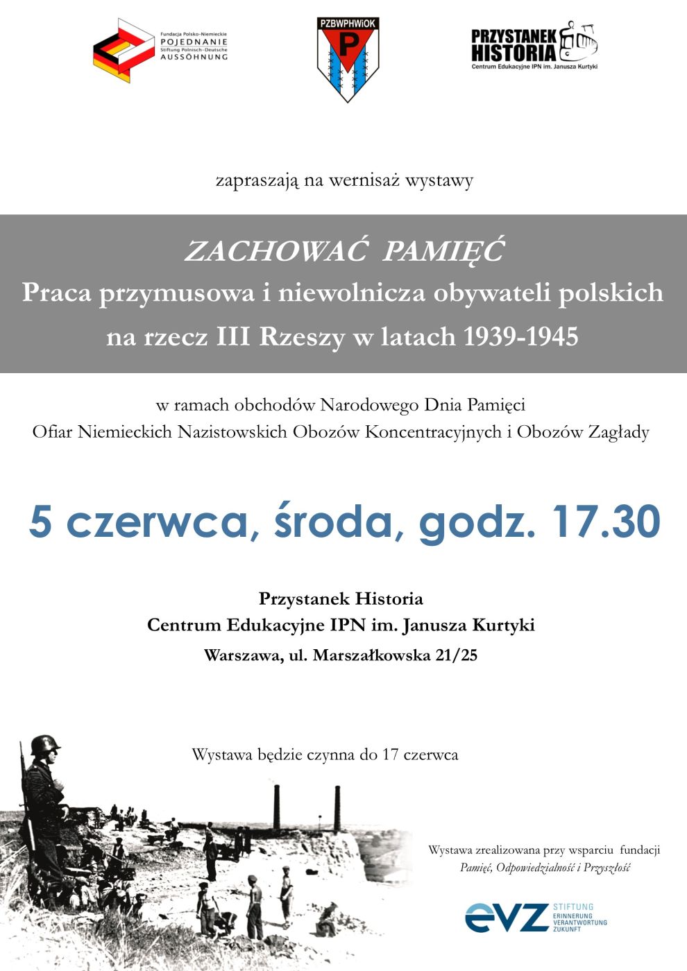 „Przystanek Historia” Centrum Edukacyjne IPN im. Janusza Kurtyki zaprasza na uroczyste otwarcie wystawy „Zachować pamięć. Praca przymusowa i niewolnicza obywateli polskich na rzecz III Rzeszy w latach 1939-1945” w ramach obchodów Narodowego Dnia Pamięci Ofiar Niemieckich Nazistowskich Obozów Koncentracyjnych i Obozów Zagłady.
