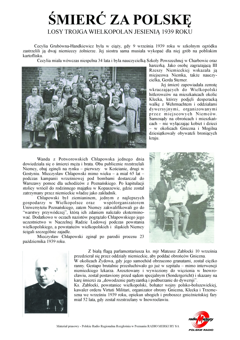 Nauczycielka Cecylia Grubówna-Handkiewicz była w ciąży, gdy w szkolnym ogródku w Charbowie 9 września 1939 roku zastrzelili ją dwaj niemieccy żołnierze. Wanda z Potworowskich Chłapowska jednego dnia dowiedziała się o śmierci męża – Mieczysława Chłapowskiego – i brata Edwarda Potworowskiego. Obu publicznie rozstrzelali Niemcy, obaj zginęli na rynku – pierwszy w Kościanie, drugi w Gostyniu. Z białą flagą parlamentariusza ks. mjr Mateusz Zabłocki przedzierał się 10 września przez oddziały niemieckie, aby poddać obrońców Gniezna. Gdy jego samochód został obrzucony granatami, został ciężko ranny. Zginął rozstrzelany miesiąc później.