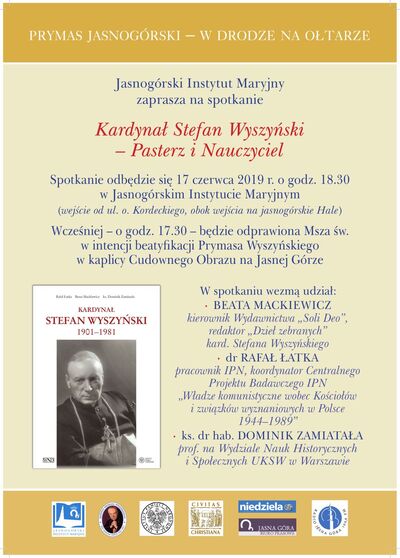 Jasnogórski Instytut Maryjny, Instytut Pamięci Narodowej i Instytut Prymasowski Stefana Kardynała Wyszyńskiego zapraszają na uroczystą prezentację publikacji Rafała Łatki, Beaty Mackiewicz i ks. Dominika Zamiatały Kardynał Stefan Wyszyński 1901–1981, wydanej przez Instytut Pamięci Narodowej i Instytut Prymasowski Stefana Kardynała Wyszyńskiego.