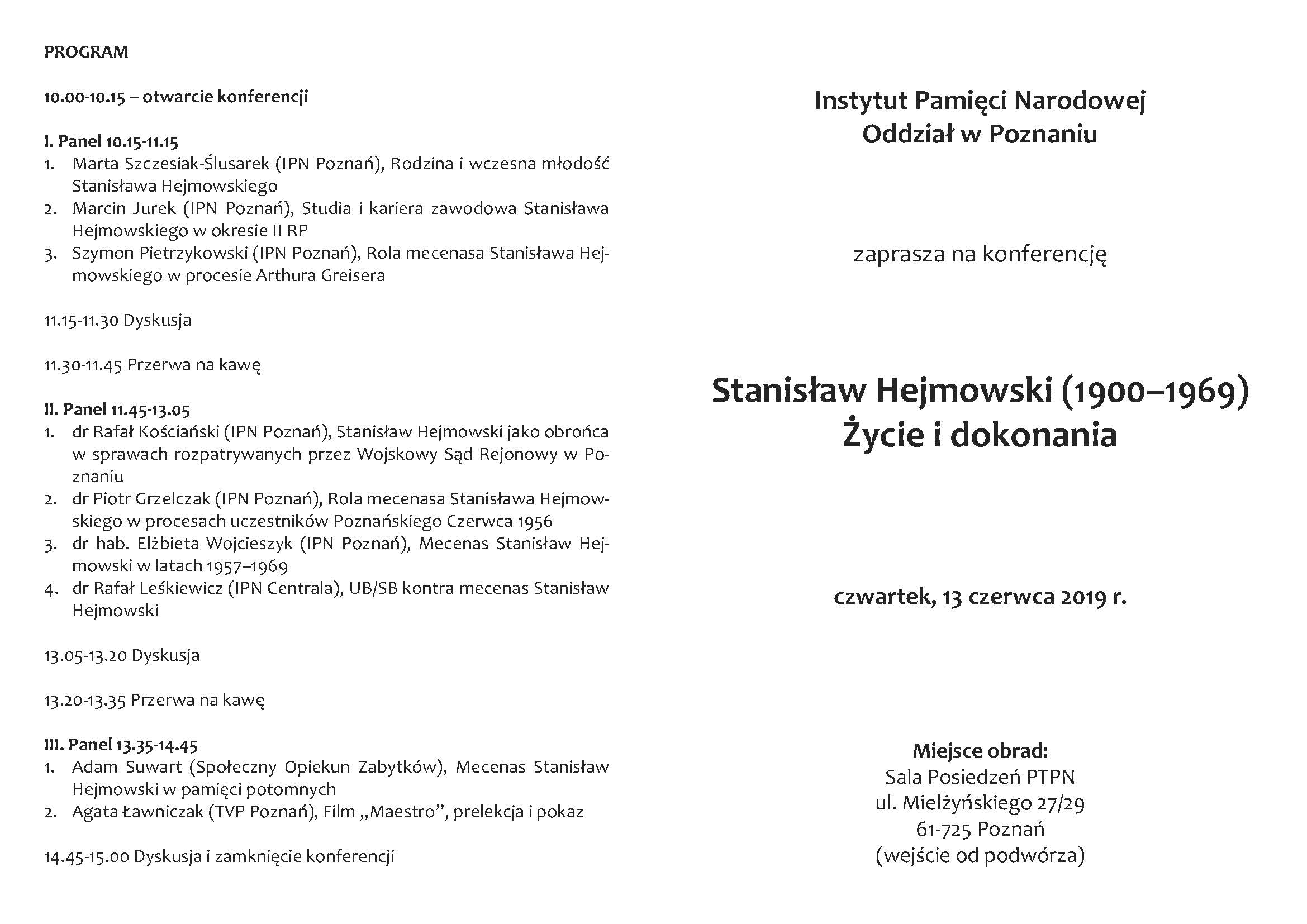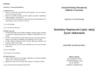 Oddziałowe Biuro Badań Historycznych IPN w Poznaniu zaprasza na konferencję naukową poświęconą życiu i dokonaniom mecenasa Stanisława Hejmowskiego, legendarnego obrońcy w procesach uczestników Poznańskiego Czerwca 1956. W zamierzeniu organizatorów, naukowa sesja w 50. rocznicę śmierci jednego z największych poznańskich bohaterów 1956 roku, winna stanowić asumpt do naukowego rozpoznania szeregu ważnych fragmentów jego niezwykle barwnego i pracowitego życia: od dzieciństwa w Kurlandii, edukacji w Piotrogrodzie i Warszawie, przez zawodową aktywność w latach 30. znaczoną udziałem w dziesiątkach głośnych procesów (także tych stricte politycznych), przymusową rolę obrońcy w rozprawie „kata Warthegau” Arthura Greisera, bohaterską postawę w procesach żołnierzy podziemia antykomunistycznego przed Wojskowym Sądem Rejonowym w Poznaniu, po epopeję procesów poznańskich 1956 i niezwykle dojmujące działania operacyjne wymierzone weń przez UB/SB.