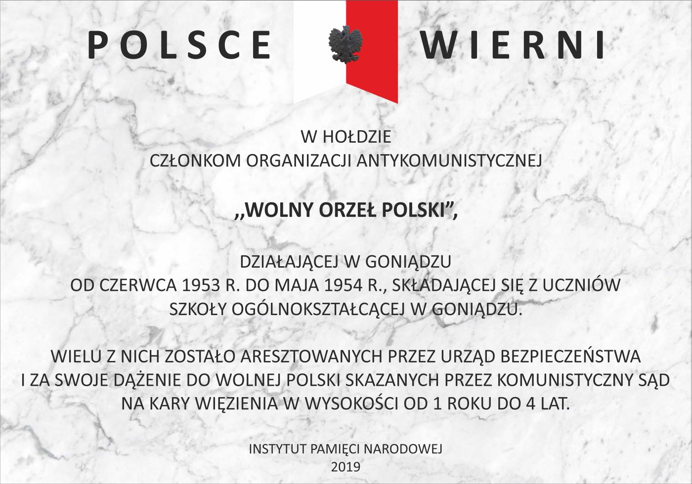 18 czerwca 2019 w budynku Zespołu Szkolno-Przedszkolnego w Goniądzu (ul. 3 Maja 18) została odsłonięta tablica upamiętniająca nielegalną organizację antykomunistyczną „Wolny Orzeł Polski”.