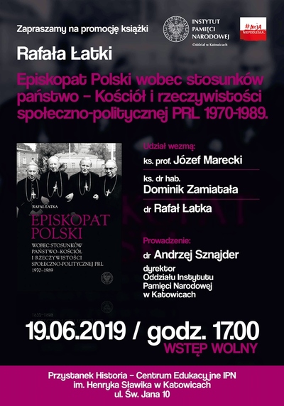 W środę 19 czerwca 2019 r. w Centrum Edukacyjnym IPN w Katowicach im. Henryka Sławika „Przystanek Historia”, przy ul. św. Jana 10 (III piętro), odbyła się promocja książki dr. Rafała Łatki Episkopat Polski wobec stosunków państwo–Kościół i rzeczywistości społeczno-politycznej PRL 1970–1989.