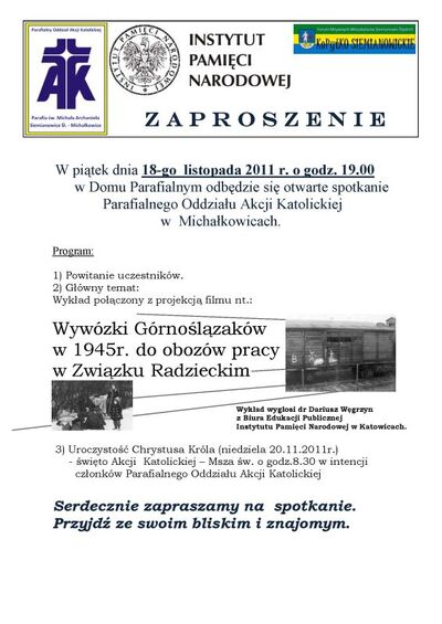 18 listopada 2011 r. w Domu Parafialnym przy parafii pw. św. Michała Archanioła w Siemianowicach Śl.- Michałkowicach (ul. Kościelna 1) odbył się wykład dr. Dariusza Węgrzyna (OBEP Katowice) „Wywózki Górnoślązaków w 1945 r. do obozów pracy w Związku Radzieckim”. Po wykładzie wyświetlono film „Przemilczana tragedia”. Organizatorami spotkania były: Parafialny Oddział Akcji Katolickiej parafii pw. św. Michała Archanioła w Michałkowicach oraz Oddziałowe Biuro Edukacji Publicznej IPN w Katowicach.