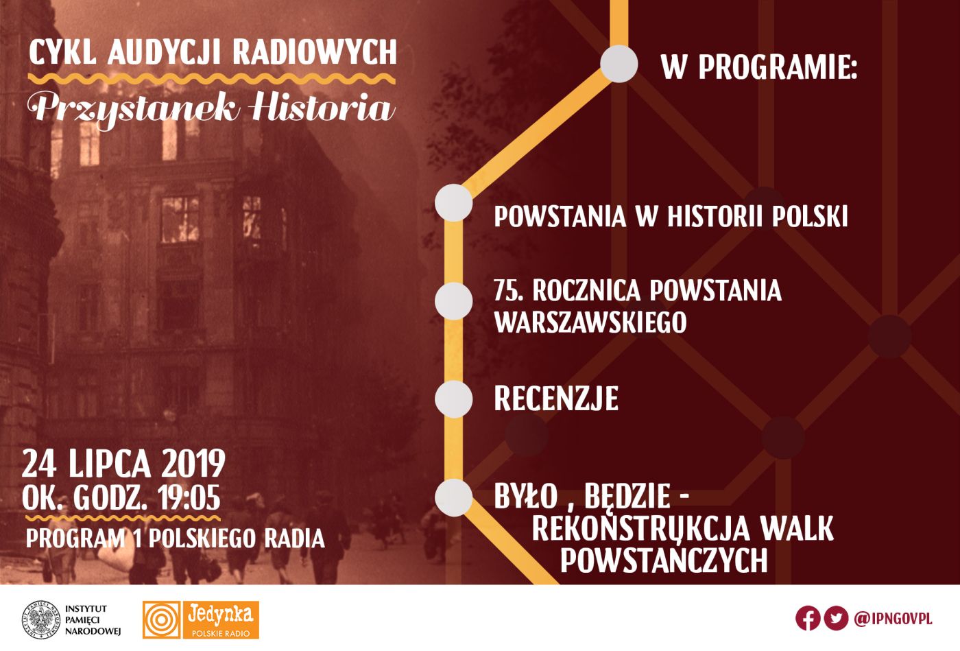 Cykl audycji „Przystanek Historia” realizowany jest wspólnie przez Instytut Pamięci Narodowej i Program I Polskiego Radia. Audycje będą emitowane na antenie radiowej Jedynki co dwa tygodnie, w każdą środę – od lipca do grudnia 2019 r. Rozmowy poświęcone będą ważnym wydarzeniom, które wpłynęły na dzieje Polski w XX wieku oraz ludziom, którzy tę historię tworzyli.