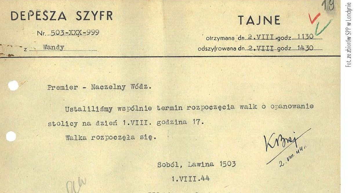 W tym momencie wszystko stało się jasne – pierwsza depesza informująca o podjęciu jawnej walki w Warszawie została wysłana do Bazy we Włoszech. Stamtąd bowiem władze Polskiego Państwa Podziemnego spodziewały się uzyskać pomoc w postaci zrzutów lotniczych. Depesza była zaadresowana do premiera Stanisława Mikołajczyka i do Naczelnego Wodza gen. Kazimierza Sosnkowskiego.
