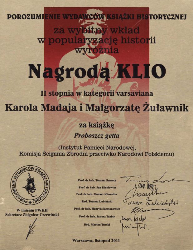 Książka „Proboszcz getta” Karola Madaja i Małgorzaty Żuławnik, poświęcona ks. Marcelemu Godlewskiemu – w czasie okupacji hitlerowskiej proboszczowi parafii Wszystkich Świętych w Warszawie, otrzymała Nagrodę KLIO II stopnia w kategorii varsaviana.