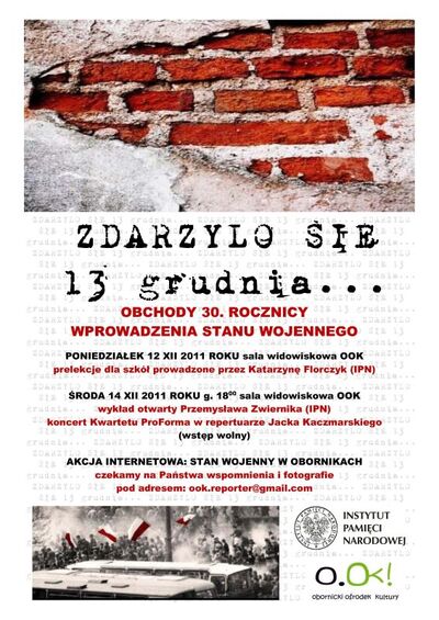 W dniu 14 grudnia 2011 r. w ramach obchodów 30. rocznicy wprowadzenia stanu wojennego w sali widowiskowej Obornickiego Ośrodka Kultury pracownik Oddziałowego Biura Edukacji Publicznej IPN w Poznaniu Przemysław Zwiernik wygłosił wykład otwarty pt. „Zdarzyło się 13 grudnia…” Po wykładzie odbył się koncert Kwartetu ProForma, który wykonał utwory z repertuaru Jacka Kaczmarskiego.