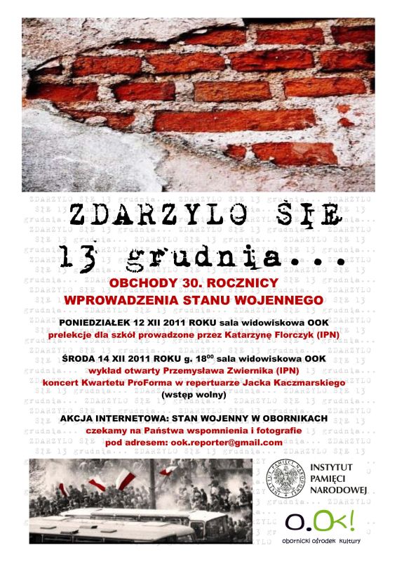 W dniu 12 grudnia 2011 r. w ramach obchodów 30. rocznicy wprowadzenia stanu wojennego w sali widowiskowej Obornickiego Ośrodka Kultury pracownik Oddziałowego Biura Edukacji Publicznej IPN w Poznaniu, Katarzyna Florczyk, wygłosi prelekcję dla uczniów pt. „Zdarzyło się 13 grudnia…”
