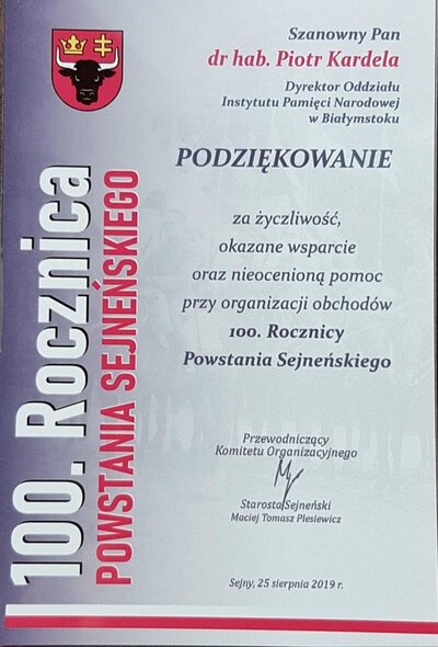 24 sierpnia 2019 r. rozpoczęły się dwudniowe obchody 100. rocznicy Powstania Sejneńskiego. W Ośrodku Kultury w Sejnach dr hab. Piotr Kardela oraz dr Paweł Warot dokonali uroczystego otwarcia wystawy „Powstanie Sejneńskie” przygotowanej przez Oddziałowe Biuro Edukacji Narodowej IPN w Białymstoku. Prezentacji wystawy towarzyszył katalog, który otrzymali wszyscy uczestnicy uroczystości. Ponadto pracownicy IPN rozdali przybyłym gościom koszulki okolicznościowe przygotowane w związku z obchodzoną rocznicą. Kolejnym punktem upamiętniania wydarzeń sprzed 100 lat była promocja książki prof. dr. hab. Wiesława Jana Wysockiego „Powstanie Sejneńskie 1919” oraz projekcja filmu dokumentalnego pt. „Rodzina Niepodległej: Powstanie Sejneńskie 1919”. Na zakończenie pierwszego dnia obchodów prof. dr hab. Grzegorz Nowik oraz dr hab. Sławomir Cenckiewicz – autor biografii Tadeusza Katelbacha, powstańca sejneńskiego - wzięli udział w panelu historycznym.