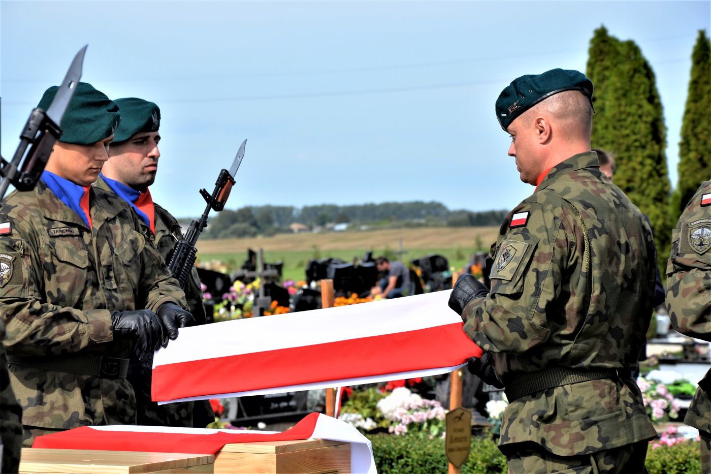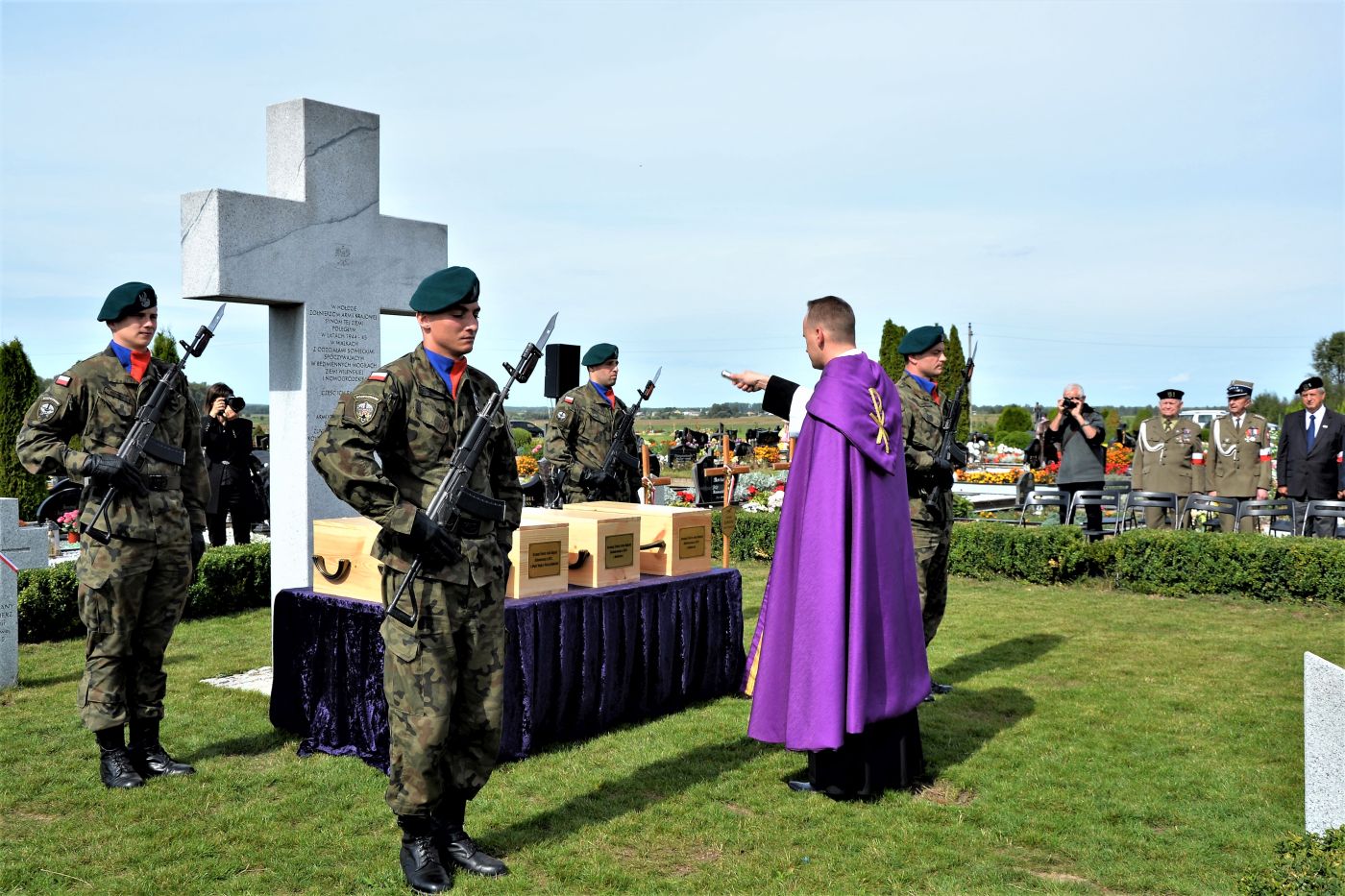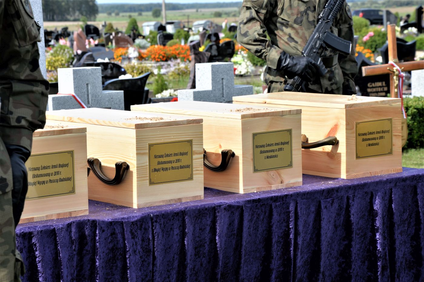 – Bóg każdego z Was przyjmuje dziś i wita po imieniu – mówił w homilii pogrzebowej ks. Tomasz Trzaska. – Przychodzimy tu dzisiaj szczęśliwi, dumni, ale także bezradni. Czujemy się tak, bo mimo postępu nauk przy waszych trumnach dziś wiszą tabliczki „Nieznany żołnierz Wojska Polskiego”. I chociaż w każdym roku identyfikujemy tylu naszych bohaterów to wciąż niekiedy jesteśmy bezradni, bo nie w każdym przypadku jest to możliwe. I to nie tak, że państwo polskie czegoś nie dopełniło. Tak po prostu czasem bywa, że na trumnie i grobie żołnierza bardzo często – w polskim krajobrazie – znajdujemy tabliczkę „Nieznany Żołnierz Polski”(...). Bogu niech będą dzięki za to wielkie narodowe przebudzenie, za trud poszukiwania i identyfikacji tych, którzy przelali krew za Polskę. Każdy dotyk akt archiwalnych, łopaty, pędzelka i innych archeologicznych narzędzi, aż w końcu dotyk odnalezionych szczątków są tym samym, czym wzięcie do ręki pióra przez Adama Mickiewicza czy dotknięcie klawiszy fortepianu przez Fryderyka Chopina. To gesty, które „Polskę stanowią”– mówił w homilii ks. Trzaska.