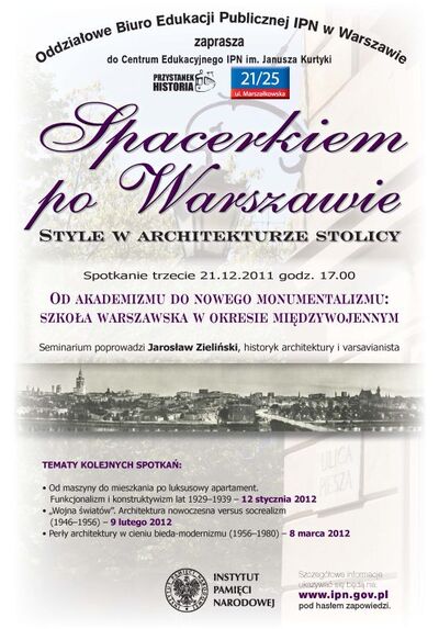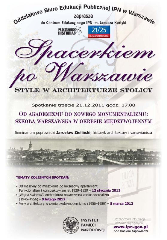 Szósta edycja wykładów dla nauczycieli historii, języka polskiego, wiedzy o społeczeństwie, studentów kierunków humanistycznych oraz uczniów wybierających tematy związane z kulturą i historią najnowszą do ustnej prezentacji maturalnej z języka polskiego. Proponujemy sześć spotkań w cyklu miesięcznym (październik 2011 – marzec 2012), prezentujących różnorodność stylistyczną architektury Warszawy na przestrzeni XIX i XX w. Przedstawione zostaną założenia architektoniczne/urbanistyczne i ich stylistyka (gmachy użyteczności publicznej, obiekty przemysłowe, architektura sportowa i rekreacyjna, architektura mieszkaniowa, obiekty kultu) oraz ich wpływ na kształt miasta i życie mieszkańców – na tle historycznym, społecznym i ideologicznym. Udział w seminarium – jako forma doskonalenia zawodowego – zostanie potwierdzony pisemne.