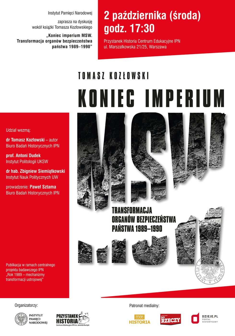 2 października 2019 roku w „Przystanku Historia” – Centrum Edukacyjnym IPN w Warszawie odbyła się dyskusja wokół książki Tomasza Kozłowskiego „Koniec imperium MSW. Transformacja organów bezpieczeństwa państwa 1989–1990”.
