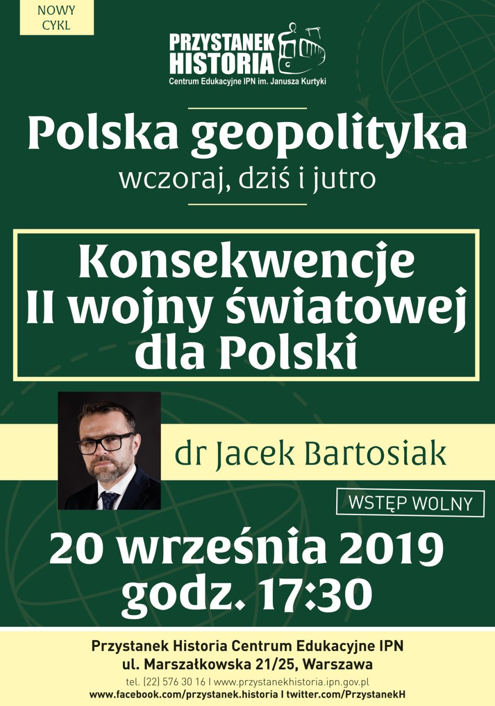 20 września 2019 roku, w Przystanku Historia – Centrum Edukacyjnym IPN im. Janusza Kurtyki przy ul. Marszałkowskiej 21/25 w Warszawie, odbyło się pierwsze spotkanie z cyklu „Polska geopolityka wczoraj, dziś i jutro”. O skutkach II wojny światowej dla Polski mówił dr Jacek Bartosiak.