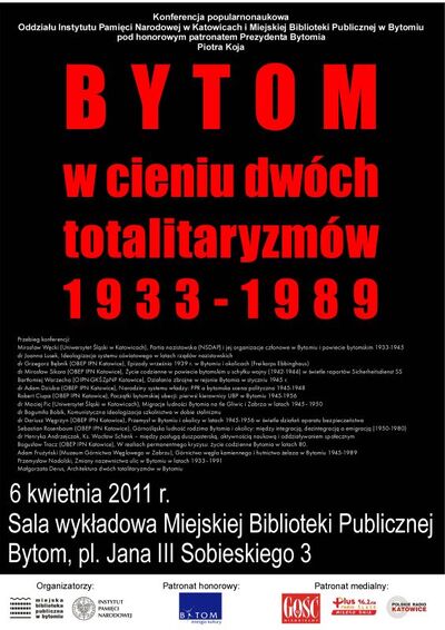 Oddział Instytutu Pamięci Narodowej w Katowicach wraz z Miejską Biblioteką Publiczną w Bytomiu zorganizował konferencję popularnonaukową „Bytom w cieniu dwóch totalitaryzmów: 1933–1989”, która odbyła się 6 kwietnia 2011 r. w siedzibie Miejskiej Biblioteki Publicznej w Bytomiu (pl. Jana III Sobieskiego 3). Konferencja odbyła się pod patronatem honorowym Piotra Koja – Prezydenta Bytomia. Patronat medialny: „Gość Niedzielny”, Radio Plus, Polskie Radio Katowice. Konferencji towarzyszyła prezentacja wystaw katowickiego IPN: „Górnośląski Azyl” oraz „Oczy i uszy bezpieki. Metody inwigilacji społeczeństwa przez Służbę Bezpieczeństwa za pomocą środków technicznych: tajnej obserwacji, dokumentacji fotograficznej perlustracji korespondencji i podsłuchów w latach 1956–1989”.