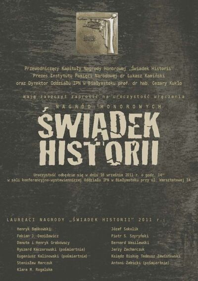 W dniu 16 września 2011 r. w siedzibie Oddziału IPN w Białymstoku odbyła się uroczysta gala z okazji wręczenia Nagród Honorowych „Świadek Historii”. W III edycji Nagrody Kapituła pod przewodnictwem Prezesa IPN dr. Łukasza Kamińskiego uhonorowała tym prestiżowym wyróżnieniem 13 spośród 35 kandydatów zgłoszonych przez samorządy lokalne, instytucje, stowarzyszenia i osoby prywatne. Wśród nagrodzonych znaleźli się: