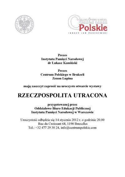 14 stycznia 2012 r. o godzinie 20.00 w Brukseli (Rue du Croissant 68) została uroczyście otwarta wystawa „Rzeczpospolita utracona”, przygotowana przez Oddziałowe Biuro Edukacji Publicznej IPN w Warszawie.