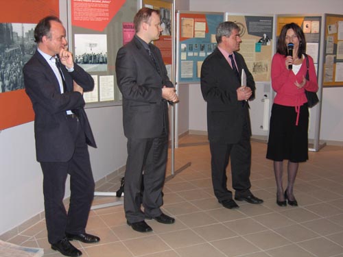 1. Od prawej: Justyna Skowronek - kierownik referatu wystaw i edukacji historycznej OBEP IPN Gdańsk, Edmund Krasowski - dyrektor Oddziału IPN w Gdańsku, dr Łukasz Kamiński - zastępca dyrektora BEP IPN, Wojciech Sikora - pracownik Instytutu Literackiego w Paryżu; wernisaż wystawy.
