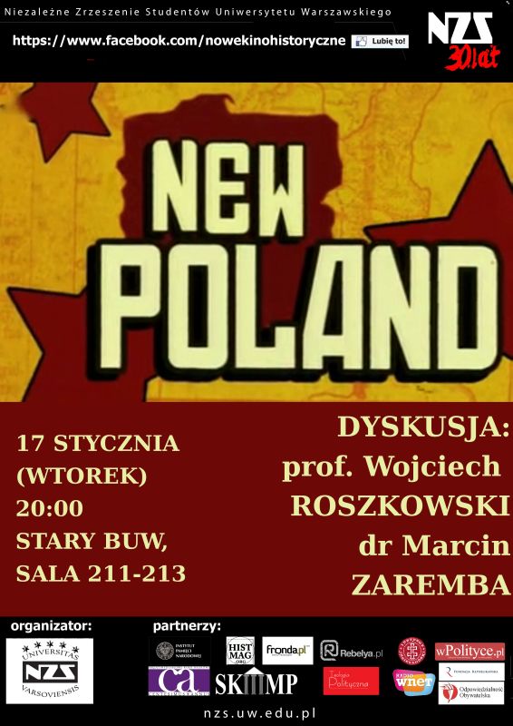 Niezależne Zrzeszenie Studentów Uniwersytetu Warszawskiego zorganizowało kolejne spotkanie z cyklu „Nowe Kino Historyczne”. Tym razem zaprezentowany został film Roberta Kaczmarka „New Poland”.