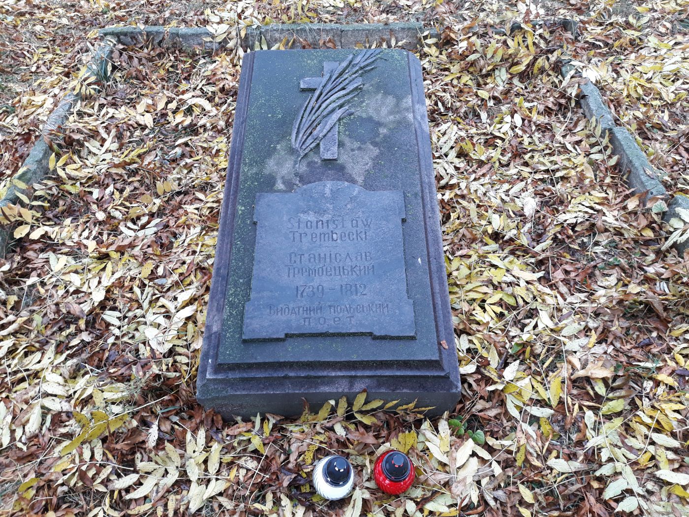 Napis na płycie grobu: Stanisław Trembecki 1739–1812. Wybitny polski poeta – Tulczyn, 22 października 2019. Fot. Mateusz Marek (IPN) -