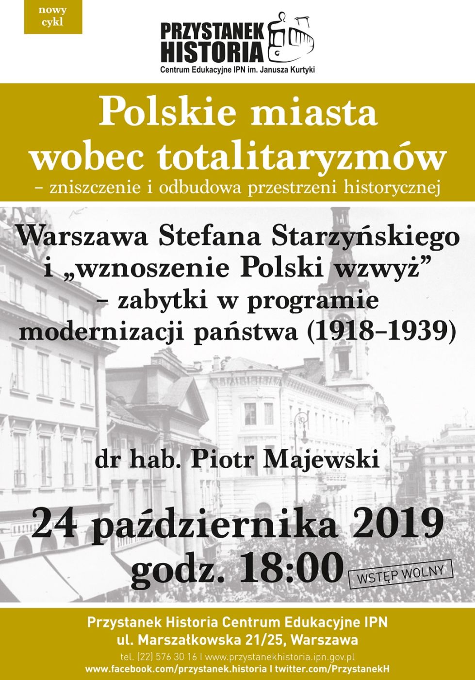 24 października 2019 roku, w Centrum Edukacyjnym IPN im. Janusza Kurtyki „Przystanek Historia” w Warszawie, odbył się wykład dr. hab. Piotra Majewskiego „Warszawa Stefana Starzyńskiego i »wznoszenie Polski wzwyż« – zabytki w programie modernizacji państwa (1918–1939)” z cyklu „Polskie miasta wobec totalitaryzmów”.