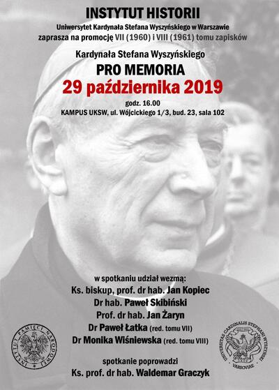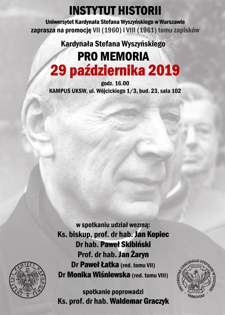 Uniwersytet Kardynała Stefana Wyszyńskiego i Instytut Pamięci Narodowej zapraszają na prezentację VII i VIII tomu zapisków „Pro memoria” prymasa Stefana Wyszyńskiego opracowanych przez Rafała Łatkę i Monikę Wiśniewską. Tomy VII i VIII obejmują zapiski kardynała Stefana Wyszyńskiego z lat 1960–1961, czyli okresu „Wielkiej Nowenny”, oraz dążenia przez władze PRL do wypchnięcia Kościoła katolickiego ze sfery publicznej.