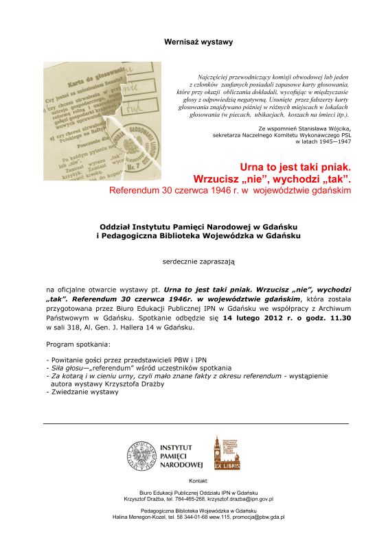 14 lutego br. została oficjalnie otwarta w Gdańsku wystawa „Urna to jest taki pniak. Wrzucisz »nie«, wychodzi »tak«. Referendum 30 czerwca 1946 r. w województwie gdańskim”. Wernisaż wystawy odbył się w Pedagogicznej Bibliotece Wojewódzkiej im. Macierzy Szkolnej w Gdańsku, przy al. gen. J. Hallera 14.