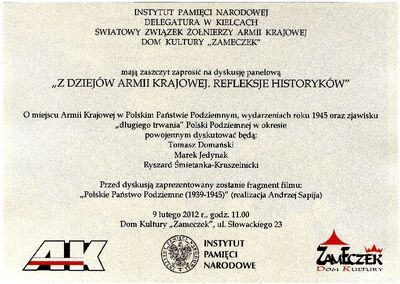 9 lutego 2012 r. w Domu Kultury „Zameczek” w Kielcach, ul. Słowackiego 23, odbyła sie dyskusja panelowa „Z dziejów Armii Krajowej. Refleksje historyków”. O miejscu Armii Krajowej w Polskim Państwie Podziemnym, wydarzeniach roku 1945 oraz zjawisku „długiego trwania” Polski Podziemnej dyskutowali: dr Tomasz Domański, Marek Jedynak i dr Ryszard Śmietanka-Kruszelnicki. Przed dyskusją zaprezentowany został fragment filmu „Polskie Państwo Podziemne (1939–1945)” (realizacja Andrzej Sapija).