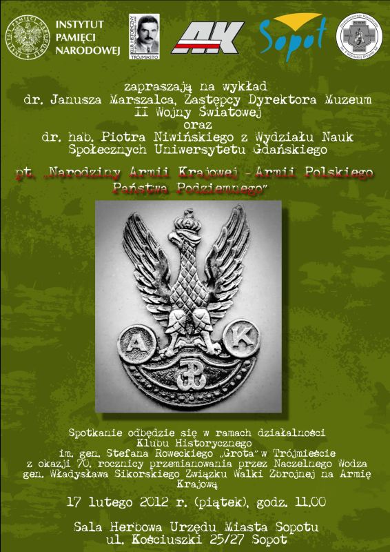 17 lutego br. w Urzędzie Miasta Sopotu (ul. Kościuszki 25/27) wykład „Narodziny Armii Krajowej – Armii Polskiego Państwa Podziemnego” wygłosili dr Janusz Marszalec, zastępca dyrektora Muzeum II Wojny Światowej w Gdańsku, oraz dr hab. Piotr Niwiński z Uniwersytetu Gdańskiego.