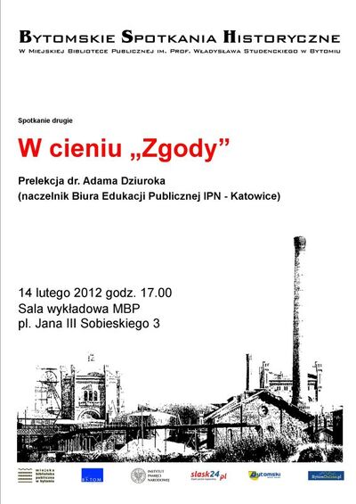 14 lutego 2012 r. w sali wykładowej gmachu głównego Miejskiej Biblioteki Publicznej w Bytomiu (plac Jana III Sobieskiego 3) odbyła się dyskusja panelowa z udziałem dr. Adama Dziuroka (OBEP Katowice), zatytułowana „W cieniu »Zgody«”. Spotkanie poprowadził Sebastian Rosenbaum z katowickiego IPN.