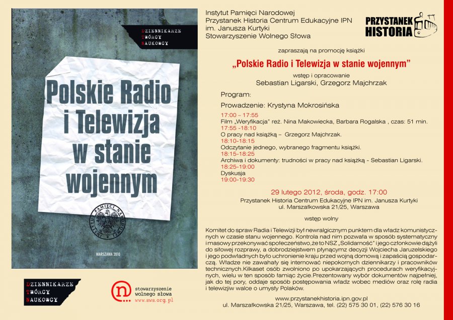 Książka „Polskie Radio i Telewizja w stanie wojennym” to pierwsza tak obszerna publikacja na temat funkcjonowania Komitetu ds. Radia i Telewizji po 13 grudnia oraz przygotowań do wprowadzenia stanu wojennego w tej instytucji. W spotkaniu – prowadzonym przez Krystynę Mokrosińską – wzięli udział bohaterowie tamtych wydarzeń. Interesujące dla każdego uczestnika było porównanie stylu zarządzania mediami 30 lat temu i dzisiaj.