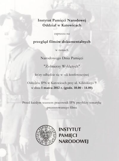 1 marca 2012 r. w sali konferencyjnej w siedzibie Oddziału Instytutu Pamięci Narodowej w Katowicach (ul. Kilińskiego 9) odbędzie się przegląd filmów dokumentalnych w ramach Narodowego Dnia Pamięci Żołnierzy Wyklętych. Przed każdym seansem pracownik IPN przybliży tematykę prezentowanego filmu.