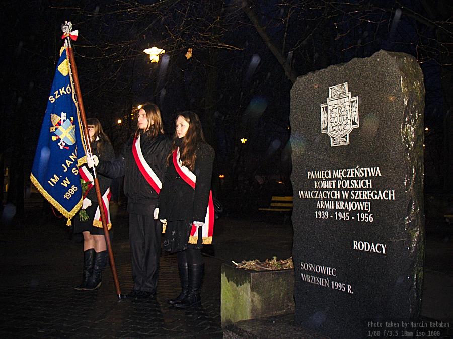 - 18 00 Apel Poległych pod pomnikiem Męczeństwa Kobiet Polskich Walczących w Szeregach AK oraz złożenie kwiatów i zapalenie zniczy (obok kościoła u zbiegu ulicy Orlej i Nowopogońskiej)