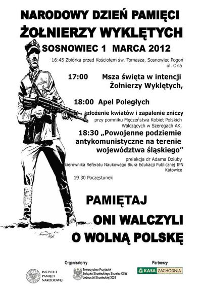 1 marca 2012 r. w Sosnowcu odbyły się uroczystości z okazji Narodowego Dnia Pamięci Żołnierzy Wyklętych. Organizatorzy wydarzenia: Towarzystwo Przyjaciół Związku Strzeleckiego Strzelec OSW Jednostki Strzeleckiej 3024 wraz z katowickim IPN.