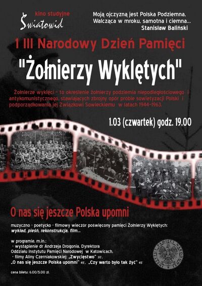 1 marca 2012 r. o godz. 19.00 w kinie studyjnym „Światowid” (ul. 3 Maja 7) odbył się muzyczno-poetycko-filmowy wieczór poświęcony pamięci Żołnierzy Wyklętych.