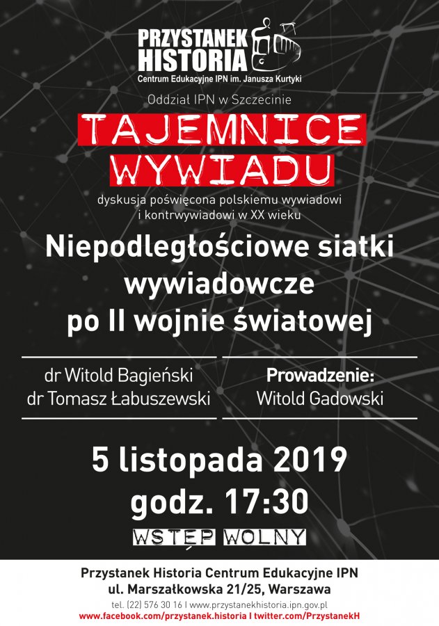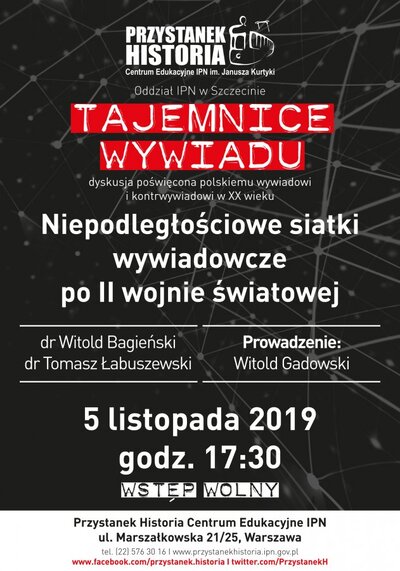 5 listopada 2019 w Centrum Edukacyjnym IPN im. Janusza Kurtyki „Przystanek Historia” odbyło się kolejne spotkanie z cyklu „Tajemnice wywiadu”. Goście Witolda Gadowskiego – dr Tomasz Łabuszewski i dr Witold Bagieński – dyskutowali o niepodległościowych siatkach wywiadowczych po II wojnie światowej.