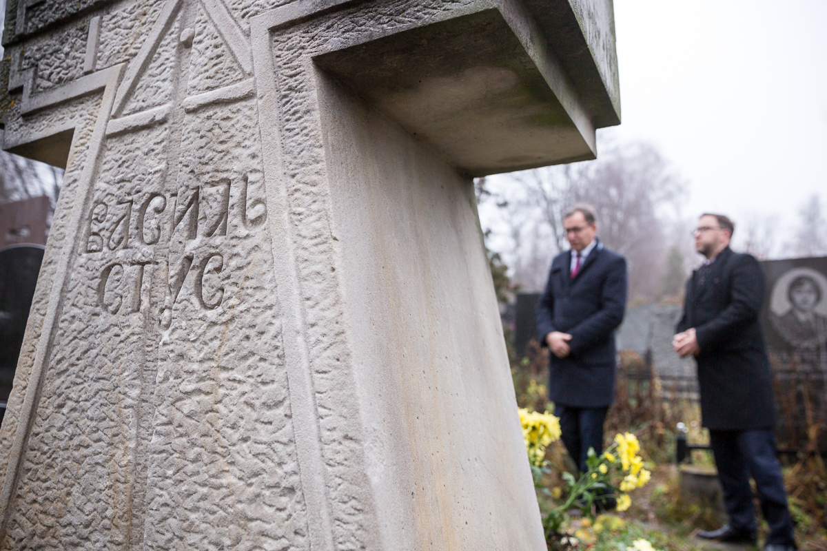 Prezes IPN Jarosław Szarek zapalił znicz na grobie ukraińskiego dysydenta, poety Wasyla Stusa. Fot. Sławek Kasper (IPN) -