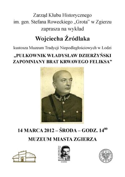 14 marca 2012 r. w Muzeum Miasta Zgierza (ul. gen. J. H. Dąbrowskiego 21) odbyło się spotkanie zgierskiego Klubu Historycznego im. gen. Stefana Roweckiego „Grota”. Z wykładem pt. „Pułkownik Władysław Dzierżyński – zapomniany brat krwawego Feliksa” wystąpił Wojciech Źródlak, kustosz Muzeum Tradycji Niepodległościowych w Łodzi Oddział Martyrologii Radogoszcz.