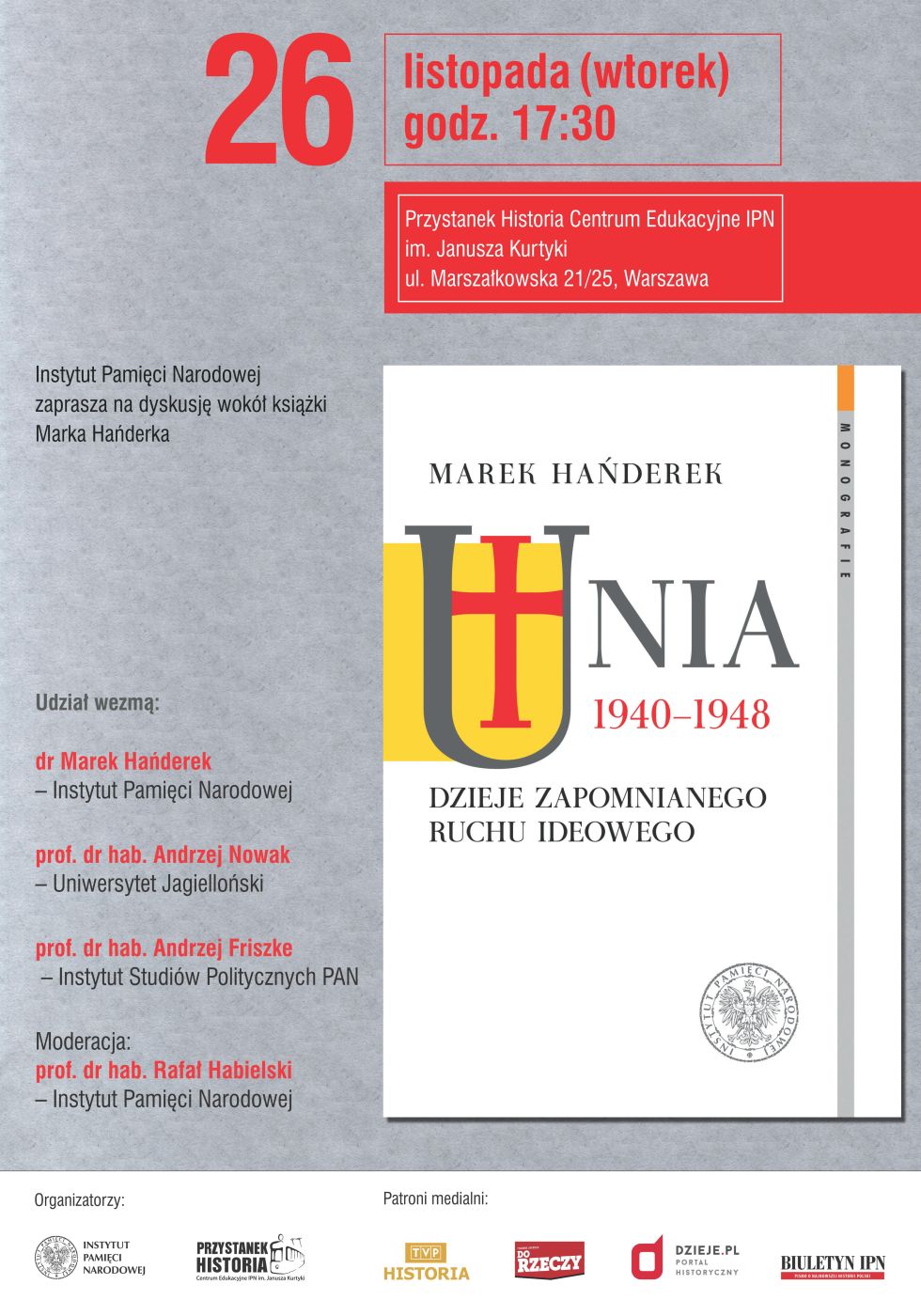 26 listopada 2019 w Centrum Edukacyjnym IPN im. Janusza Kurtyki „Przystanek Historia” odbyła się dyskusja wokół książki Marka Hańderka „Unia 1940–1948. Dzieje zapomnianego ruchu ideowego”. Udział wzięli: dr Marek Hańderek (Instytut Pamięci Narodowej), prof. dr hab. Andrzej Nowak (Uniwersytet Jagielloński), prof. dr hab. Andrzej Friszke (Instytut Studiów Politycznych PAN). Spotkanie moderował prof. dr hab. Rafał Habielski (Instytut Pamięci Narodowej)