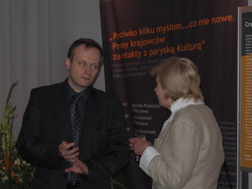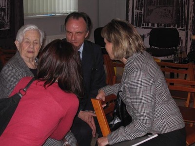 Janina Gąskiewicz, opiekunka Józefa Czapskiego w ostatnich latach życia (spędziła w Maisons-Laffitte 13 lat) w otoczeniu dr Małgorzaty Ptasińskiej-Wójcik (BEP IPN Warszawa) - autorki scenariusza wystawy, Wojciecha Sikory i Justyny Skowronek. -
