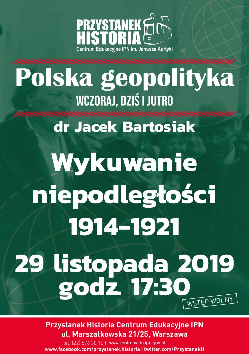29 listopada w Centrum Edukacyjnym IPN Przystanek Historia przy ul. Marszałkowskiej 21/25 w Warszawie dr Jacek Bartosiak wygłosił wykład zatytułowany „Wykuwanie niepodległości 1914–1921” z cyklu „Polska geopolityka wczoraj, dziś i jutro”.
