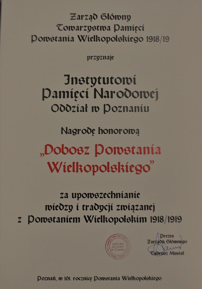 Wśród tegorocznych laureatów Nagrody Honorowej Towarzystwa Pamięci Powstania Wielkopolskiego „Dobosz Powstania Wielkopolskiego” znalazł się poznański oddział Instytutu Pamięci Narodowej, uhonorowany za „upowszechnianie wiedzy i tradycji związanej z Powstaniem Wielkopolskim 1918/1919”. Nagrodę z rąk Tadeusza Musiała – Prezesa Towarzystwa Pamięci Powstania Wielkopolskiego 1918/1919 oraz Wicemarszałka Województwa Wielkopolskiego Wojciecha Jankowiaka odebrał dyrektor dr hab. Rafał Reczek.