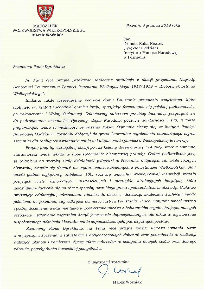 List gratulacyjny Marszałka Województwa Wielkopolskiego Marka Woźniaka