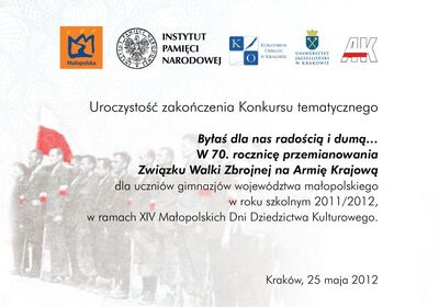 25 maja 2012 r. w Muzeum Armii Krajowej odbyło się w ramach XIV Małopolskich Dni Dziedzictwa Kulturowego uroczyste zakończenie konkursu tematycznego „Byłaś dla nas radością i dumą… W 70. rocznicę przemianowania Związku Walki Zbrojnej na Armię Krajową”. Organizatorem konkursu był Oddział Instytutu Pamięci Narodowej w Krakowie wspólnie z Województwem Małopolskim i Uniwersytetem Jagiellońskim na zlecenie Małopolskiego Kuratora Oświaty.