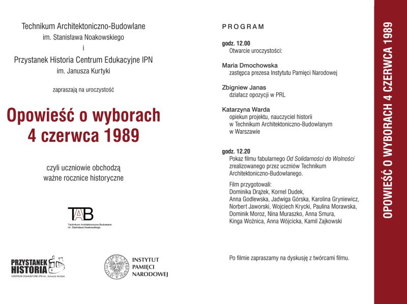 Centrum Edukacyjne IPN im. Janusza Kurtyki „Przystanek Historia” zaprasza nauczycieli i uczniów na uroczystość związaną z 23. rocznicą wyborów 4 czerwca 1989 roku, która odbędzie się 5 czerwca 2012 r. o godz.12.00 w Centrum Edukacyjnym IPN w ramach projektu „Uczniowie obchodzą ważne rocznice historyczne”.