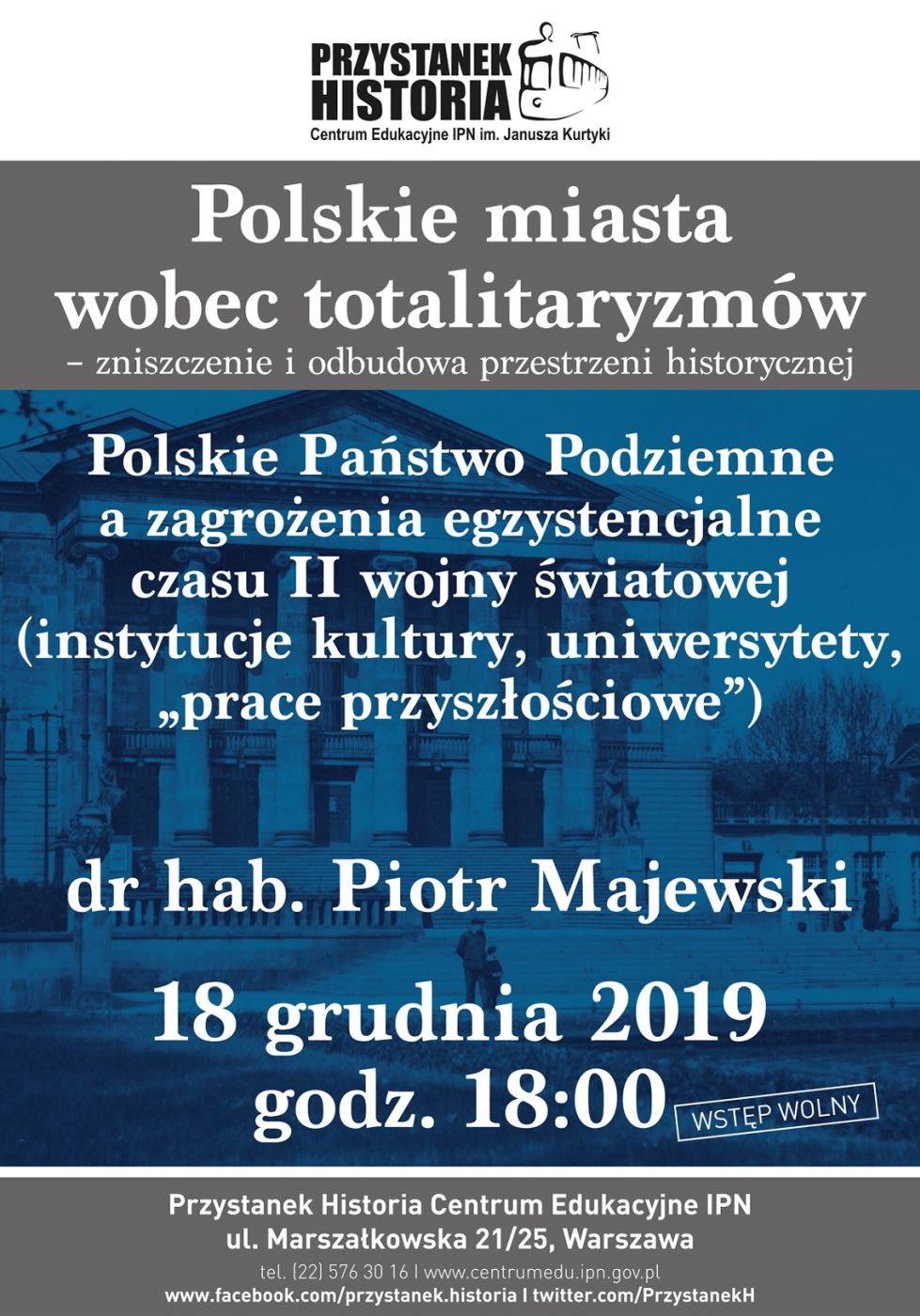 18 grudnia 2019 w Centrum Edukacyjnym IPN Przystanek Historia w Warszawie dr hab. Piotr Majewski wyglosił wykład „Polskie Państwo Podziemne a zagrożenia egzystencjalne czasu II wojny światowej (instytucje kultury, uniwersytety, „prace przyszłościowe”)” z cyklu „Polskie miasta wobec totalitaryzmów”.