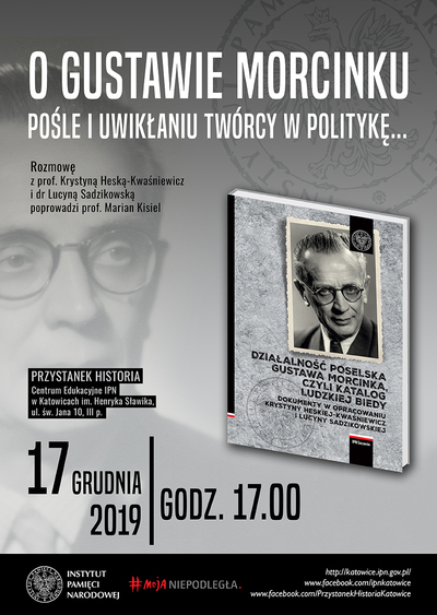 17 grudnia 2019 r., o godz. 17.00, w Centrum Edukacyjnym IPN w Katowicach im. Henryka Sławika „Przystanek Historia”, przy ul. św. Jana 10, odbyło się spotkanie „O Gustawie Morcinku pośle i uwikłaniu twórcy w politykę....”. Rozmowę z prof. Krystyną Heską-Kwaśniewicz i dr Lucyną Sadzikowską poprowadził prof. Marian Kisiel.